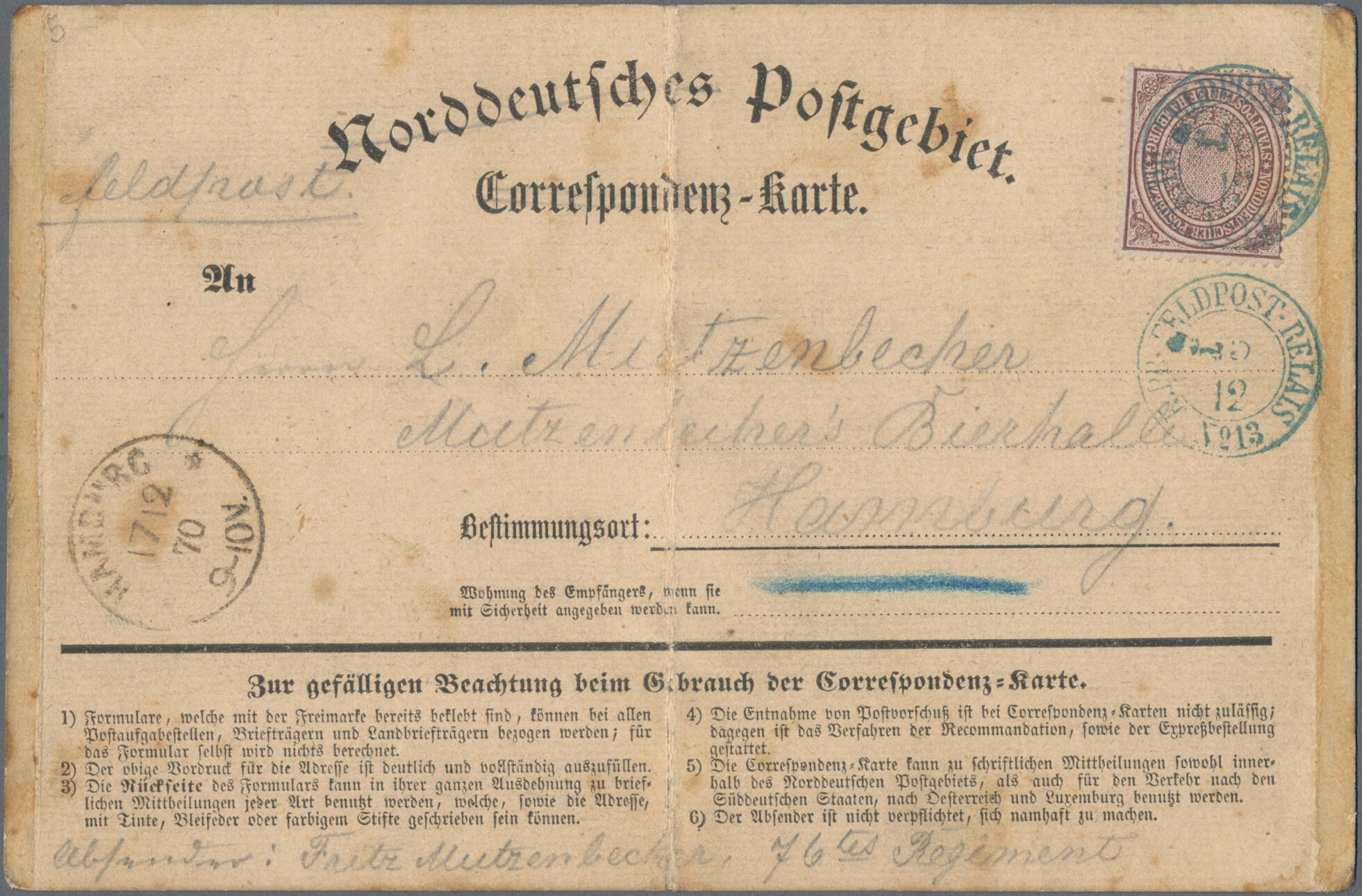 1870, NDP ½ Schilling Lilabraun Hamburger Stadtpostmarke entwertet mit blauem DKr. "K.PR. FELDPOST-RELAIS No.13. 13.12" auf "Correspondenz-Karte" aus Bar le Duc (Meuse), Frankreich nach Hamburg mit Ankunftsstempel "Hamburg 17/12 70" Handschriftlicher Vermerk "Feldpost" Formular einmal vertikal gefaltet und etwas fleckig. Einzig bekanntes Exemplar mit Feldpost Entwertung. - Aus einer NDP Sammlung die Seite 1, Seite 2 und Seite 3 aus einer Auktion (Delcampe, Köhler, 2026)