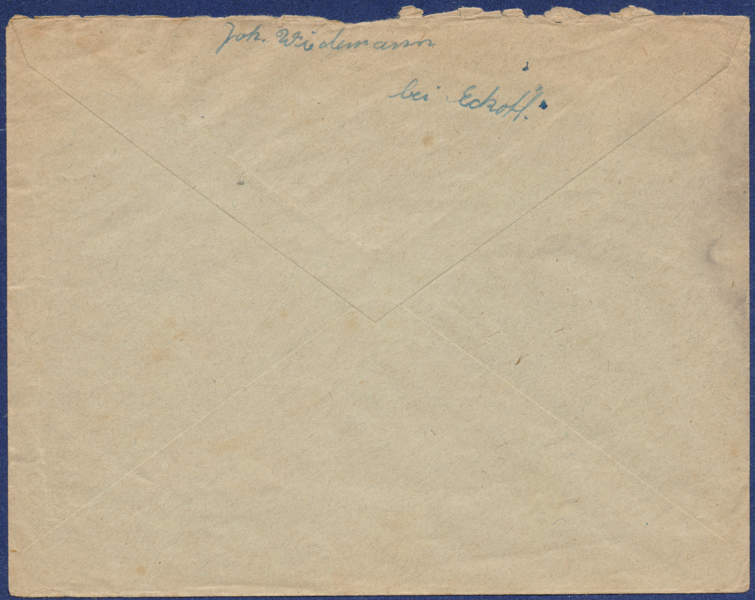 Während der Name "Eckhoff" sicher mit dem Absender in Verbindung steht, ist der Name "Joh. Wiedemann" nicht einzuordnen. Vermutlich sind die Angaben nachträglich angebracht worden, da Schriftfarbe und Schriftart anders sind.