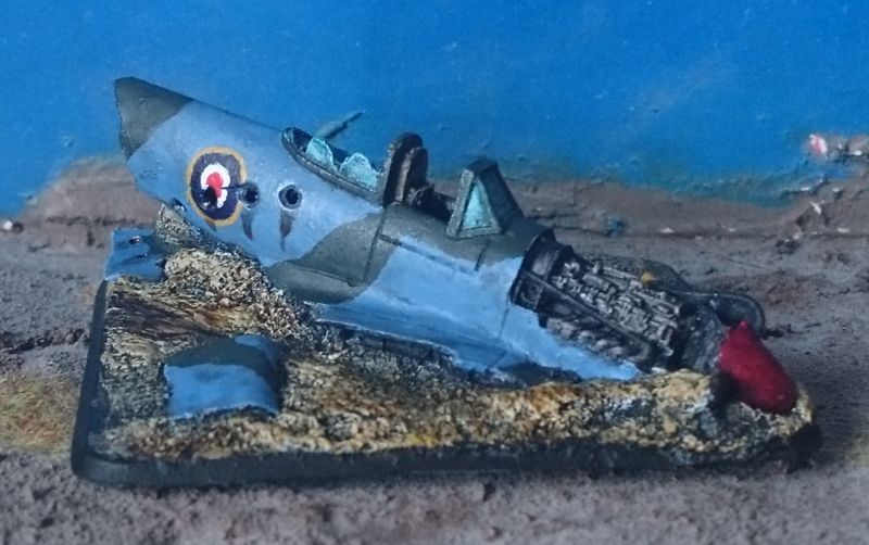 Das Modell stammt aus der Box zur 21. Panzerdivision und stellt ein abgestürztes Flugzeug vom Typ Typhoon der britischen Luftwaffe dar. Dieser, vorallem als Jagdbomber eingesetzter, Typ ist inbesondere durch seinen Einsatz in der Normandie / D-Day bekannt, wo er viele Panzer, Schützenpanzer und normale Fahrzeuge zerstörte.