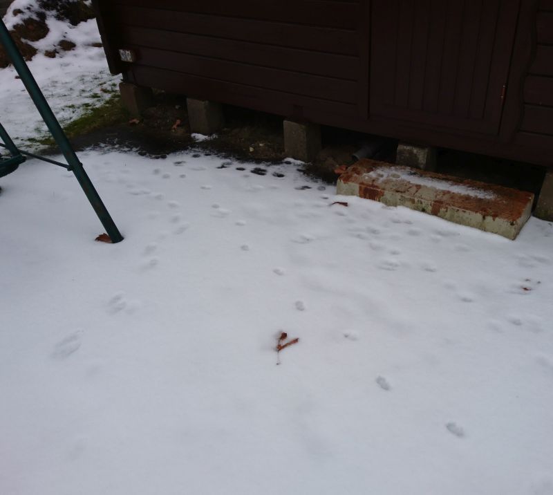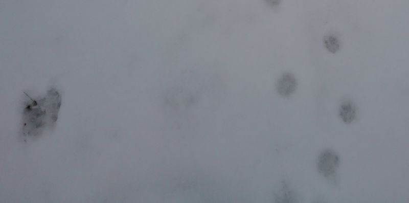 Während ich die kleinen Fussspuren erwartet hatte (vermutlich Karnickel), sind inbsesondere die großen Fußspuren mit einer Schrittlänge von knapp 50-80cm unerwartet. Hierbei muss es sich schon um eine sehr große Katze bei der Jagd oder einem Hund gehandelt haben.