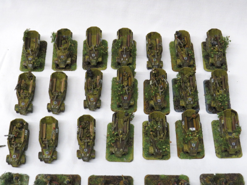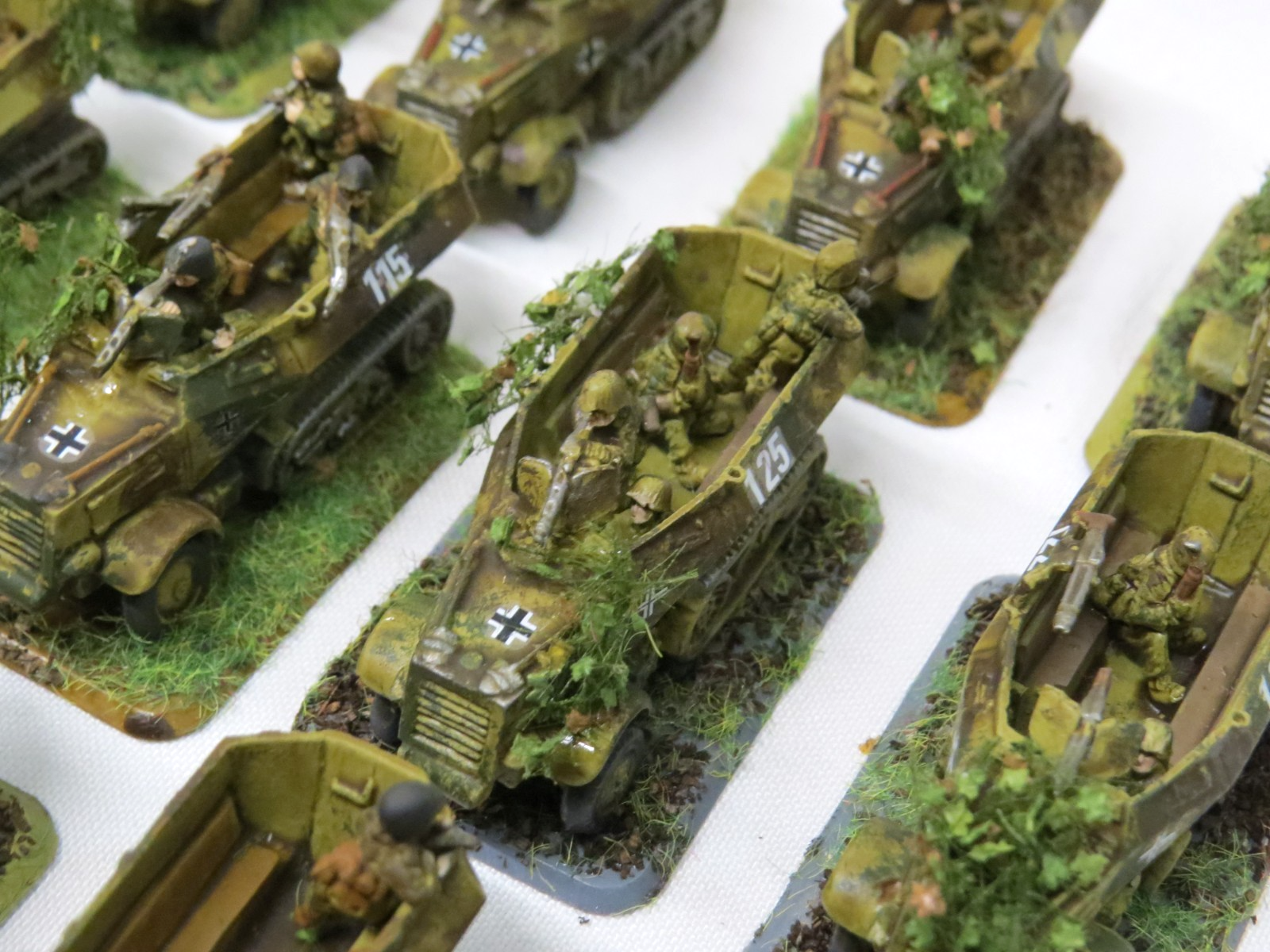 Die Figuren und Fahrzeuge sind in der Masse für die Normandiegefechte im Rahmen der 21. Panzerdivision bemalt worden. Ein Teil gehört aber auch zu der bodenständigen Armeeliste aus der 2.Edition. Generell sind die Minis für die 2.Edition ausgelegt.Enthalten sind:
