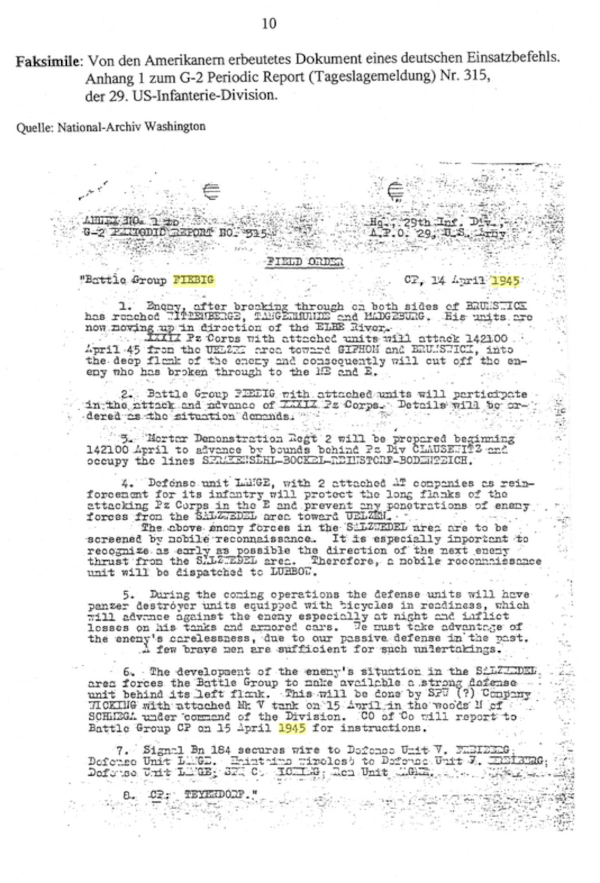 Im geheimen Tagesbericht der Wehrmacht ist für den 11. April vermerkt: "Die im Raum nordwärts Braunschweig nach Norden vorstoßenden feindlichen Panzerkräfte erreichten mit Spitzen die Räume zwölf Kilometer nordwärts Gifhorn, Rohrberg, Calbe, unbestätigt Bismark und Tangermünde.