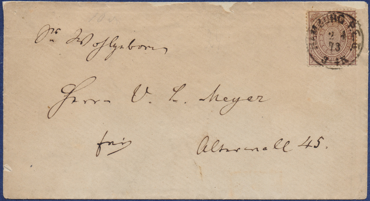 Briefmarke auf Ortsbrief mit einer Entwertung vom 02.04.1873 durch den Stempel "Hamburg P.E.5.".