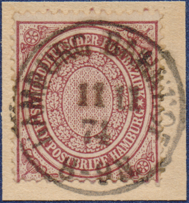Briefmarke auf Briefstück mit einer Entwertung durch den Preussen K1-Stempel vom 1867 des "Hamburg Bahnhof" am 11.11.1874.