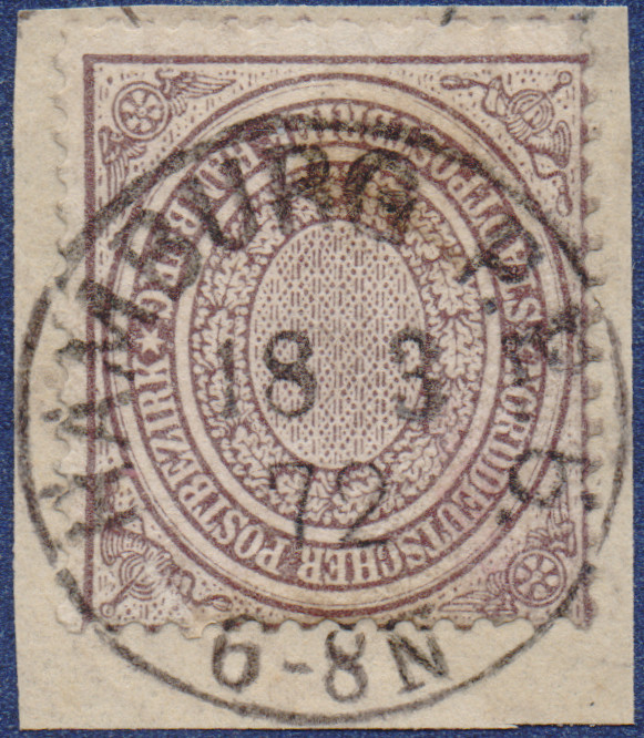 Briefmarke auf Briefstück mit einer Entwertung durch den NDP K1-Stempel "Hamburg P.E.6." am 18.03.1872.