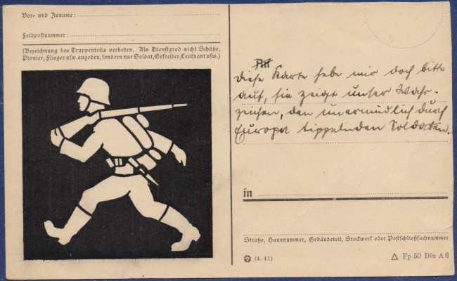 Eine Feldpostkarte (Typ Fp 50 Din A 6) mit dem "schreitenden Soldaten" als Stempel.