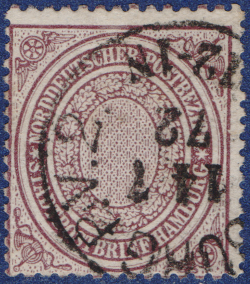 vom 11.04.2026 aus Hamburger Stadtpostmarke MiNrm. 12 und 24Briefmarke mit einer Entwertung durch den NDP R3-Stempel von "Hamburg P.E.7. Pöseldorf" am 21.04.1872.