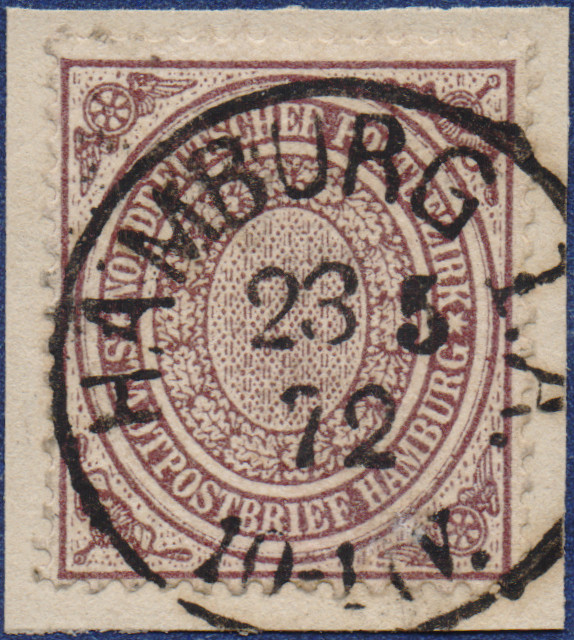 vom 23.04.2026 aus Hamburger Stadtpostmarke MiNrm. 12 und 24Briefmarke auf Briefstück mit einer Entwertung durch den NDP K1-Stempel vom Typ 5 des "Hamburg I.A." am 23.05.1872.