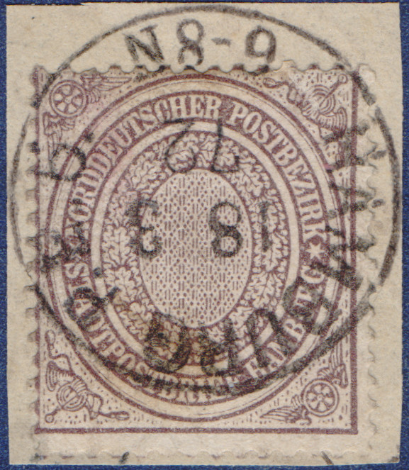vom 23.04.2026 aus Hamburger Stadtpostmarke MiNrm. 12 und 24Briefmarke auf Briefstück mit einer Entwertung durch den NDP K1-Stempel "Hamburg P.E.6." am 18.03.1872.