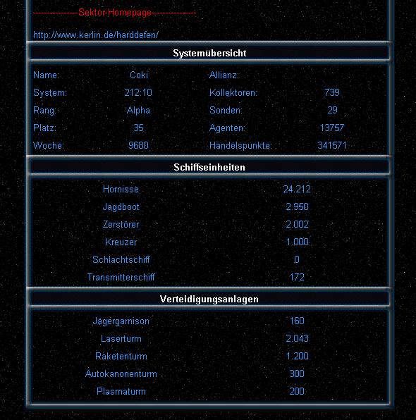 Die Struktur der Hardcore Defenders in Sachen Ally´s hat jetzt klare Formen erhalten. Mittlerweile sind 7 der 10 Sektorenmitglieder Member von (WoD). Dies hatte unteranderem dazu geführt, das wir 25k Schiffe zur Defense zur Verfügung hatten.