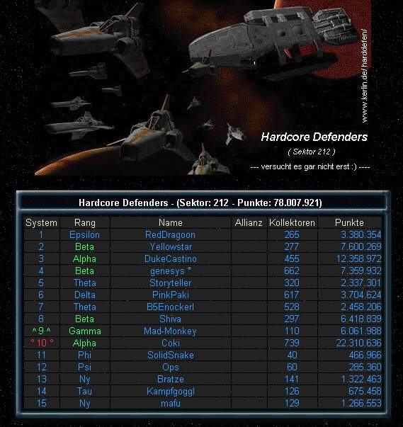 Im Sektoren Ranking liegen die Hardcore Defenders zwischen 50 und 70 mit Tendenz Richtung Oben. Das ist gut so, lag aber primär daran das einige unserer Spieler ihre Reserven in Schiffe investiert hatten und somit den Durchschnitt beträchlich gesteigert haben.