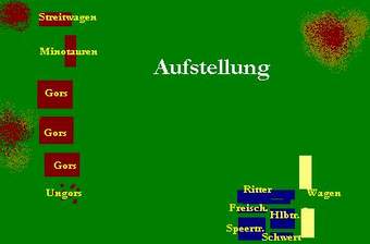 Die Ritter positionierten sich neu, um im nächsten Zug wieder gegen die Minotauren zu reiten. Die Speerträger schafften es, gegen die Tiermenschen zu siegen, rieben diese auf, und holten sie auch ein. Die Freischärler sammelten sich neu und standen nun in den Flanken der letzten Gors.