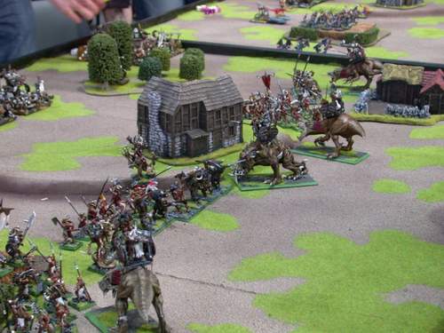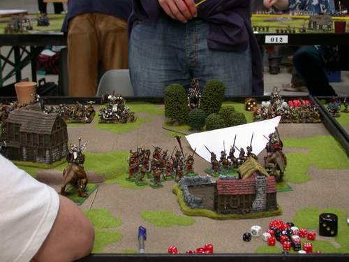 In der ersten Runde rückten wir beide vor. Meine Skinks feuerten ein paar Schüsse ab, konnte aber nur ein paar vereinzelte Tiermenschen erlegen. Wirklich hilfreich war, dass ich beide Bruten erlegen konnte, die mich doch sehr hätten behindern können. Inzwischen hatte sich die Generalsherde in dem Kornfeld platziert und bedrohte meine Skinks. Mein General und die Ritter griffen die Oger, bzw. einen Schreitwagen an; seine Generalsherde ging auf mein Stegadon. General und Ritter konnten ihr Ziele auslöschen und überranten. Sie wurden jedoch im nächsten Zug von Minotauren in die Flanke und einem Streitwagen in die Front angegriffen. Sogar die Nurglings schlossen sich diesem Angriff an. Die Generalsherde griff mein Stegadon an. Wie durch ein Wunder überlebten die Ritter fast unbeschadet den Angriff und schlugen ihre Gegner in die Flucht. Währendessen tötete mein General die Gargoyle und einen Schamanen. Die Generalsherde schaffte es nach einigen Zügen aber auch, das Stegadon in die Flucht zu schlagen. Das nachfolgende Vorstürmen kostete dann noch meinen Salamander das Leben. Damit war das Spiel auch schon zu Ende. Beide Seiten hatten einiges an Einheiten verloren, was zu einem Unentschieden (12:12) führte. Es war ein sehr spannendes Spiel, das ich gerne wiederholen würde. Auch Doomham war ein netter Spieler, dem ich gerne noch mal gegenübertreten würde.