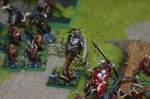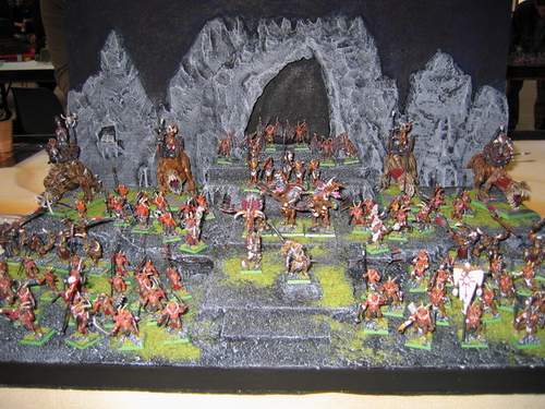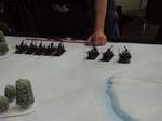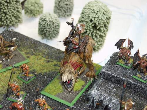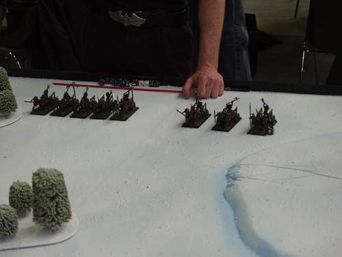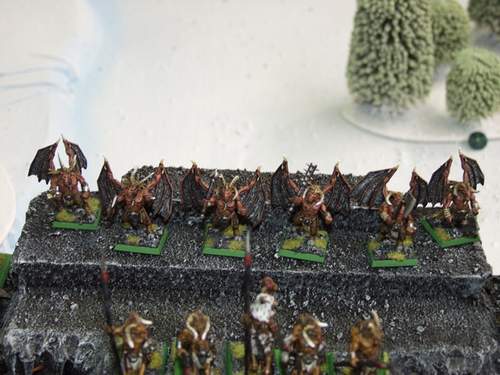 Doomham stellte seine Monster mittig auf. Zwei der Herden, die Bruten, die Khornegors und der General stellten sich mittig auf. Auf den Flanken standen weitere Zwei Herden. Die Gargoyle hielt er als Schutz bei seinen Magiern zurück.