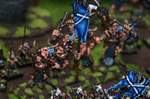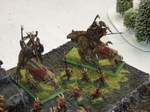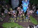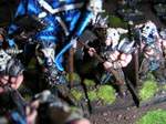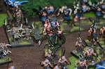 Fünftes Spiel gegen Morghur, 2x20 Gors, 10 Gors, 20-30 Chaoshunde, 1 Bannschamanen und läppische 12 Streitwagen auf der Winter/Waldplatte. Er erschaffte zwar ungefähr 20 Bruten (nicht alle gleichzeitig), aber vor einem totalen Massaker retteten ihn 1) meine Vergeßlichkeit, die Eichel zu werfen, was mich 10 Dryaden und 4 Kampftänzer kostete (meine ganzen Verluste in diesem Spiel) und 2) der Spielabbruch in der 5. Runde. Kein schöner Gegner - bei mir bestand er auf berührt-geführt und hielt sich selber nicht dran, Bruten wollte er ohne Abzug durch Gelände laufen lassen und durch 1" Lücken quetschen, viel Gejammer. Allerdings hat er sich selbst geschlagen. Wenn 20 Gors 4 Kampftänzer nicht angreifen und 15 Bogenschützen eine Flanke gegen 8 Streitwagen nicht nur halten, sondern mit etwas magiehilfe 6 erledigen, ohne dabei überdurchschnittlich gewürfelt zu haben, macht man etwas falsch, z.B. indem man beschädigte Streitwagen zurückzieht um außer Schußweite zu kommen (gegen 30" Reichweite und 2x Meister der Steine nicht sehr sinnvoll). Also leider nur ein überlegener Sieg.