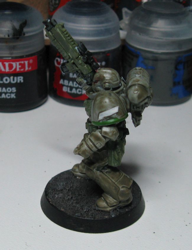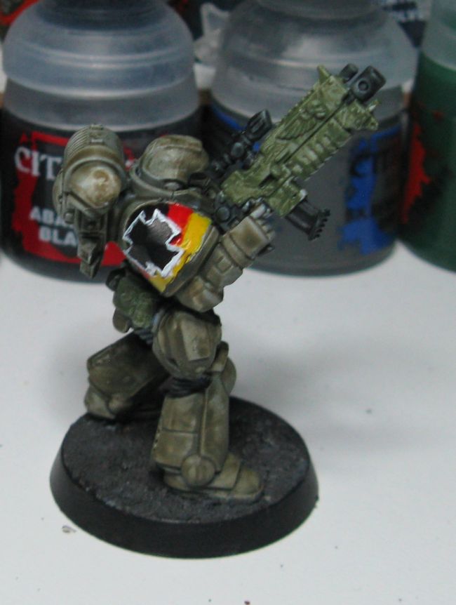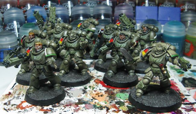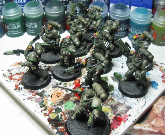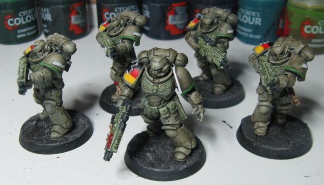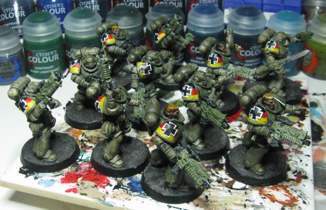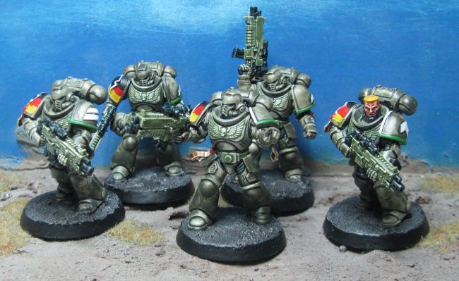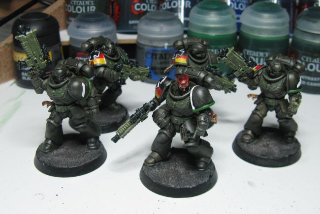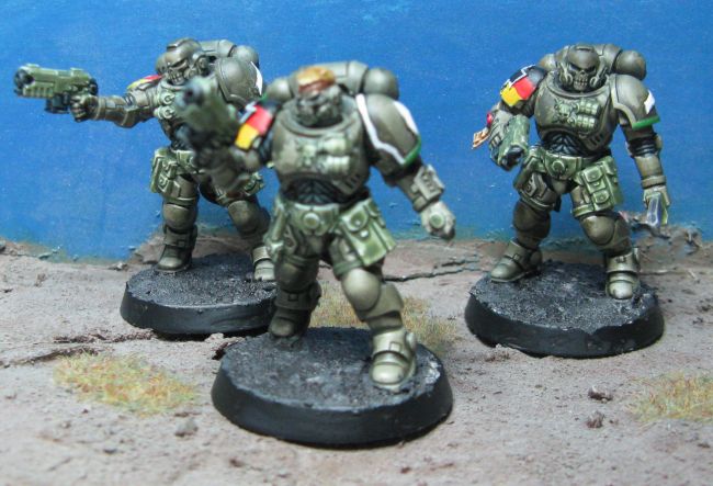 Dieser Trupp ist der einzige wo ich die Farbe deckend aufgebracht habe (also so wie bei den ursprünglichen Kraut Marines). Entsprechend dunkel wirkt die Rüstung.