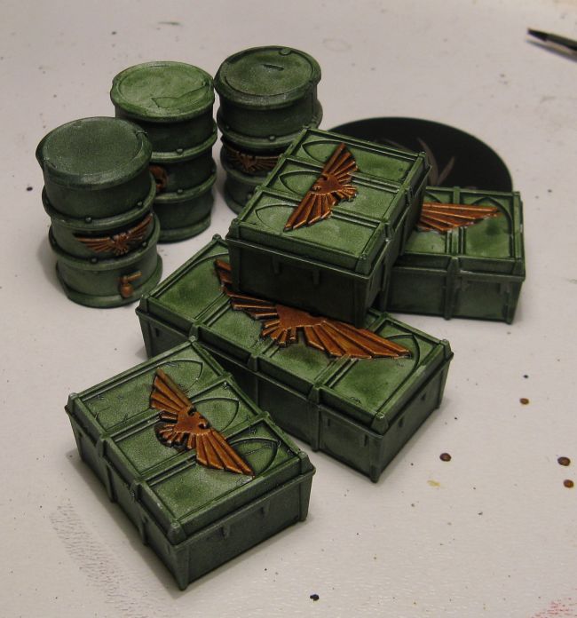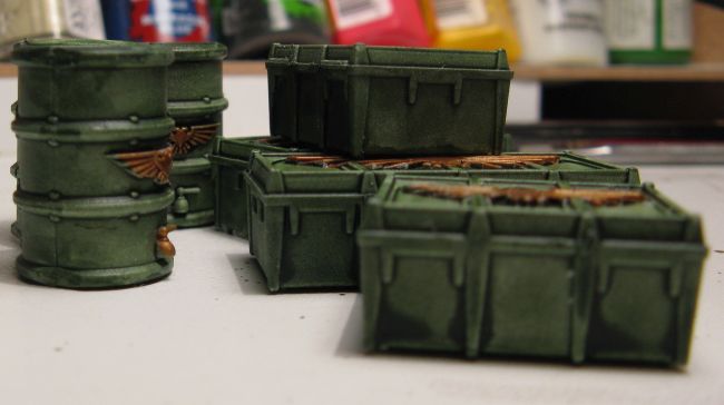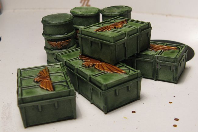 Im Heft 13 der Conquest Reihe findet sich auch ein Gussrahmen "Munitorum Container". Während der Container selber noch bemalt wird, sind die Fässer und Kisten schon fertig.