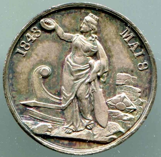 Sie wurde im Jahr 1843 nachgeprägt vom Medailleur Martin Heinrich Wilkens in Bremen in seiner Prägeanstalt (gegründet 1830) mit Bewilligung der Hamburger Behörde im Auftrag des Juweliers J. F. Brahmfeld. Entwurf, wie gehabt, von Künstler und Illustrator Jacob Gensler in Hamburg.