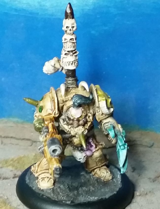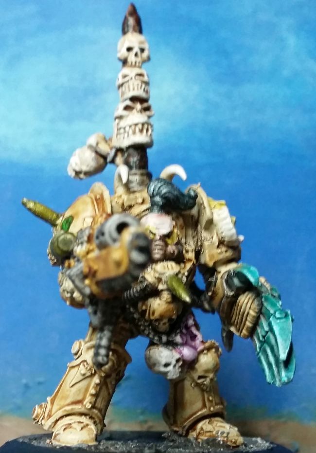 1x Aufstebender Chaos Champion in Terminatorrüstung mit Kombiwaffe (Bolter und Melter) und Energiefaust, Mal des Nurgle = 30 + 12 + 45 + 10 = 97 Punkte