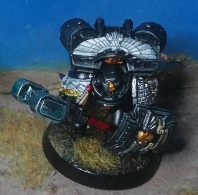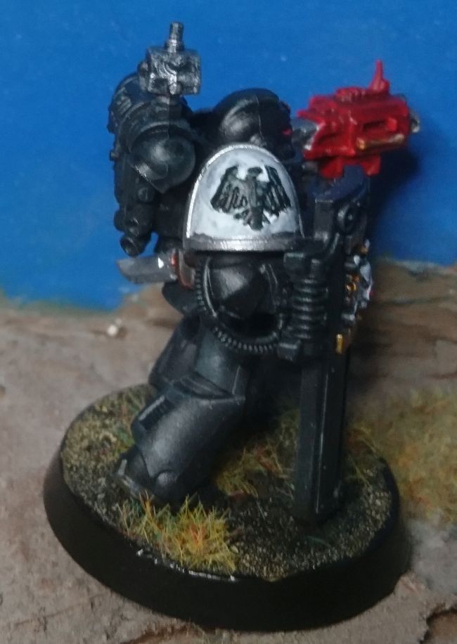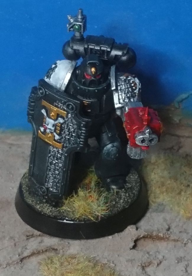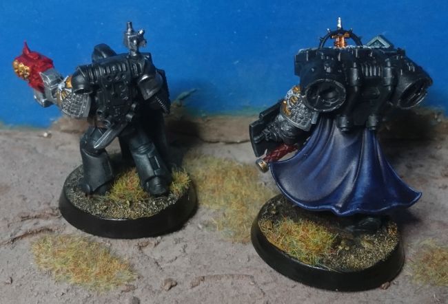Die linke Figur ist ein Taktischer mit Schild und Sturmbolter. Der rechte ein Sprungmarine mit Sturmschild und E-Hammer.