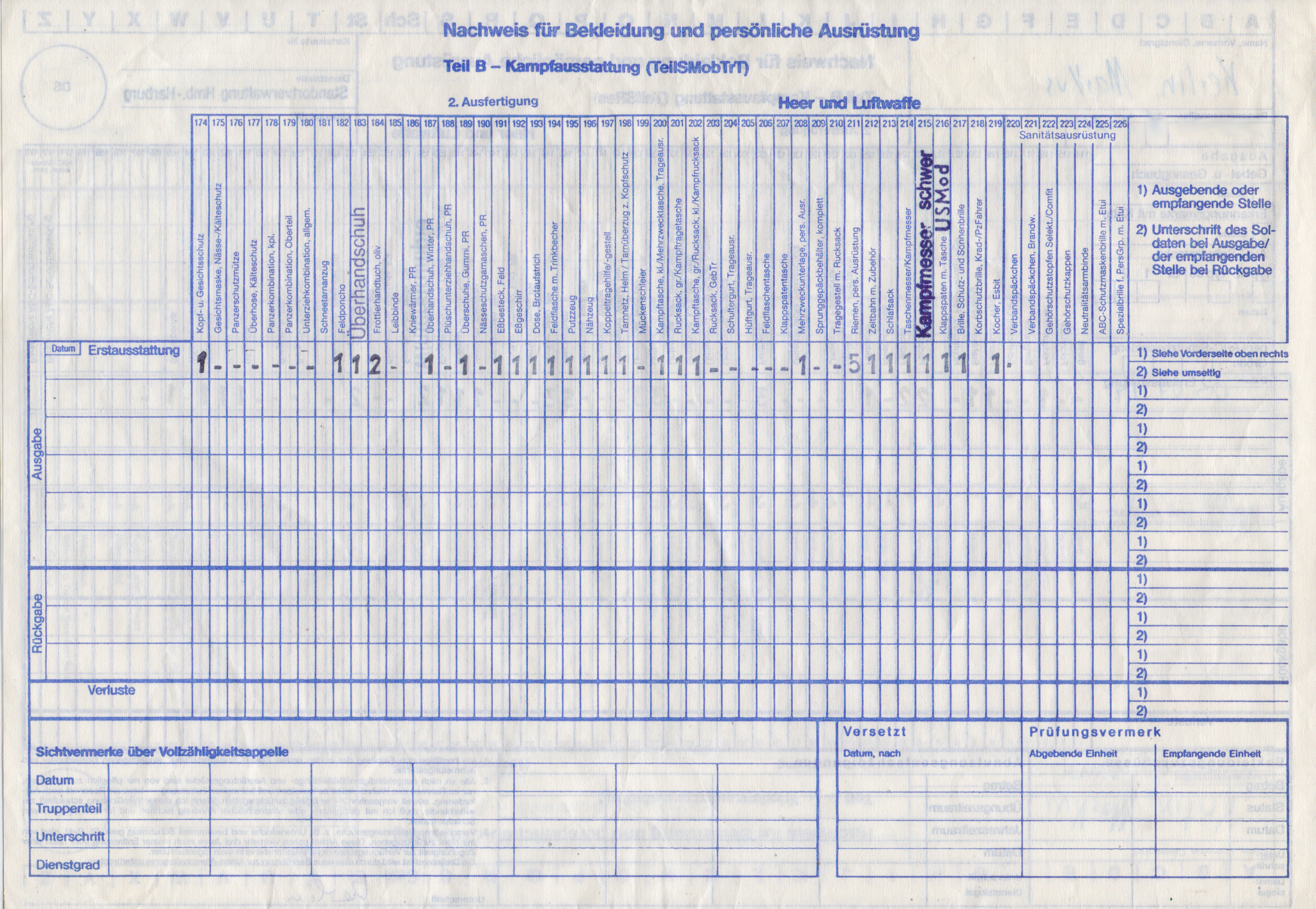 Hierbei handelt es sich um die Erstausstattung in oliv die ich erhalten habe. Gut ein Jahr später wurde ich in Flecktarn umgerüstet.