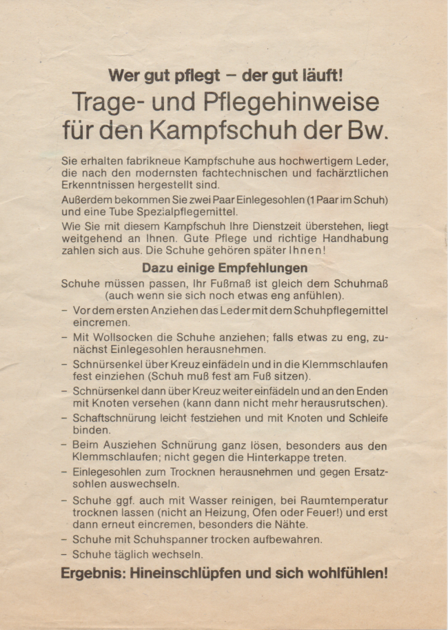 Mit der Ausstattung erhielt man auch folgenden Zettel für die Pflege und Benutzung der Kampfstiefel.