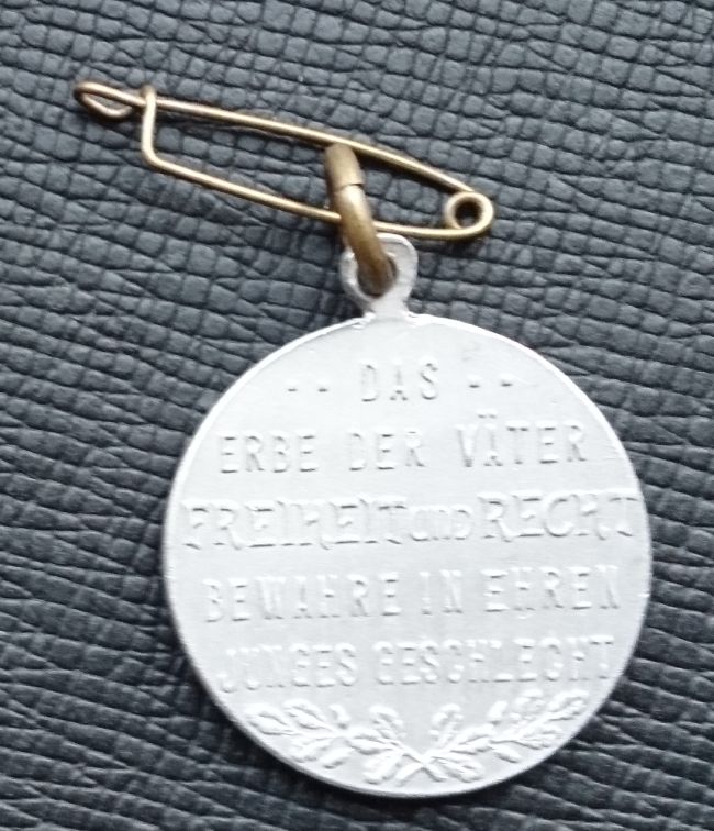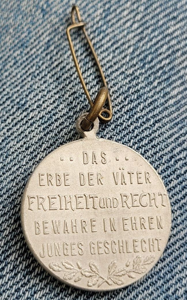 Die Rückseite zeigt den erhabenen Text "Das Erbe der Väter Freiheit und Recht bewahre in Ehre junges Geschlecht".