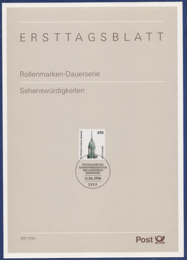 Das Ersttagsblatt enthält eine Marke, entwertet durch den Bonner Ersttagsonderstempel. Auf der Rückseite ein Informationen zur Ausgabe und zum Motiv. Interessant ist die ergänzende Grafik mit der Teilansicht auf den Michel.