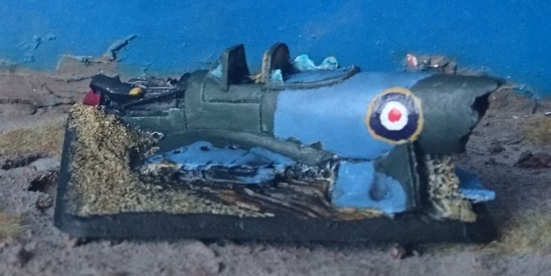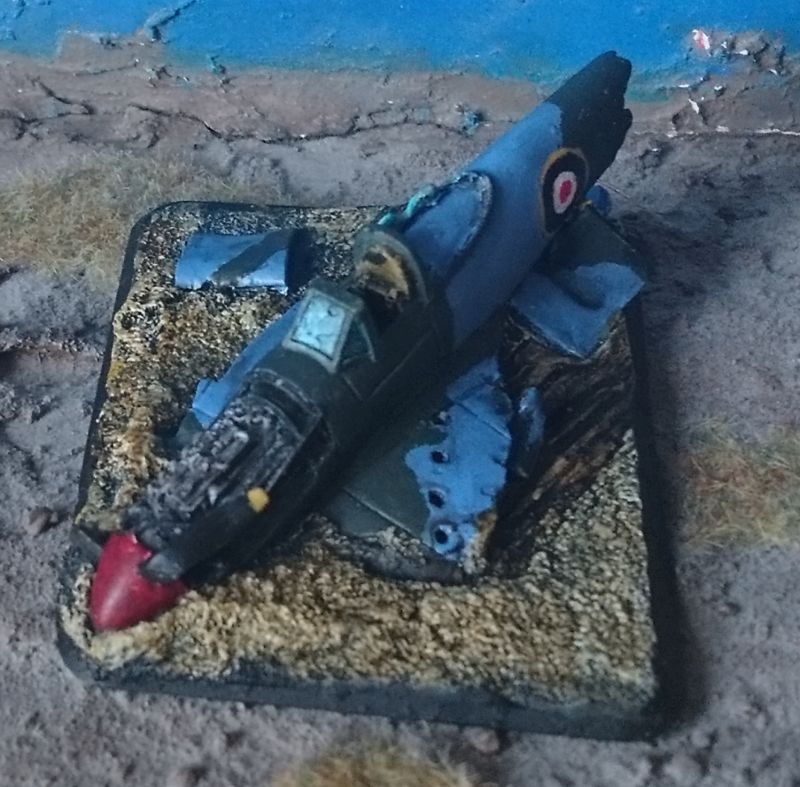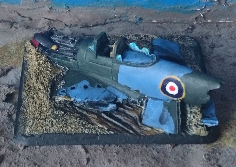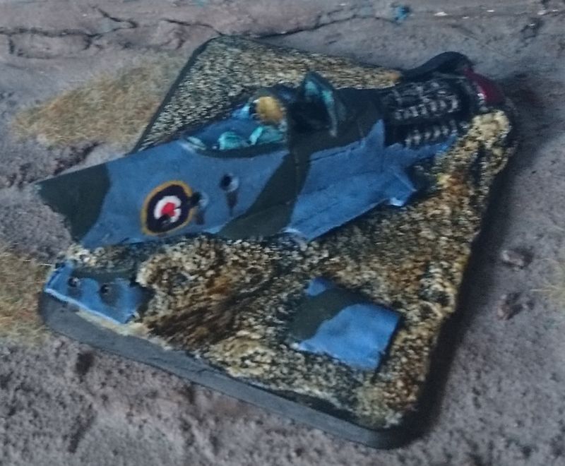 Das Modell stammt aus der Box zur 21. Panzerdivision und stellt ein abgestürztes Flugzeug vom Typ Typhoon der britischen Luftwaffe dar. Dieser, vorallem als Jagdbomber eingesetzter, Typ ist inbesondere durch seinen Einsatz in der Normandie / D-Day bekannt, wo er viele Panzer, Schützenpanzer und normale Fahrzeuge zerstörte.