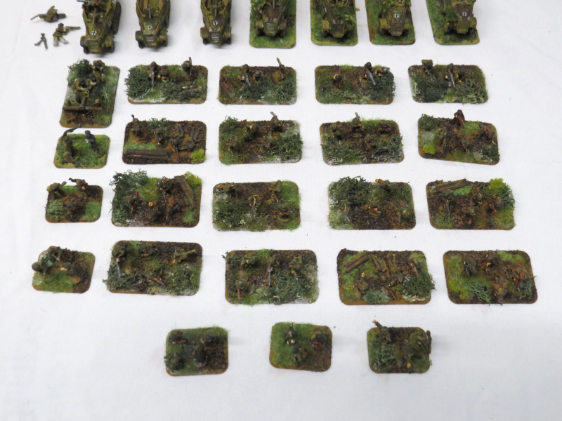 Die Figuren und Fahrzeuge sind in der Masse für die Normandiegefechte im Rahmen der 21. Panzerdivision bemalt worden. Ein Teil gehört aber auch zu der bodenständigen Armeeliste aus der 2.Edition. Generell sind die Minis für die 2.Edition ausgelegt.Enthalten sind: