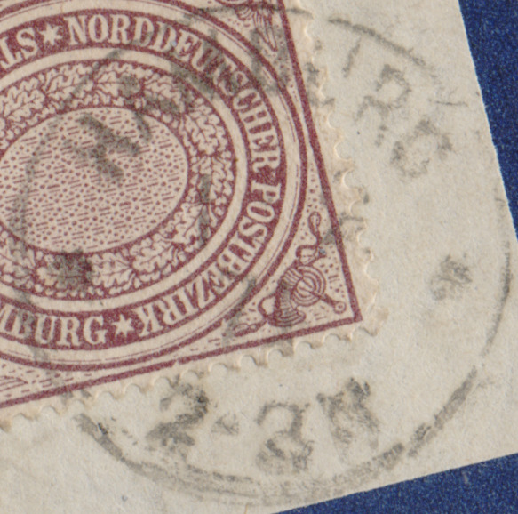 Die Entwertung erfolgt durch den ehemaligen preussischen Stempel K1 Hamburg mit Sternen am 01.02.1871.
