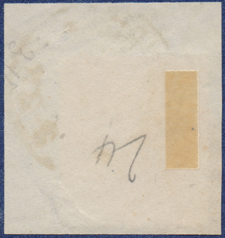 Rückseite mit Falzrest. Der Falzrest ist so angebracht, das der Stempel auf der Vorderseite richtig gezeigt wird. Ein Hinweis, das die Briefmarke aus einer Stempelsammlung stammt.