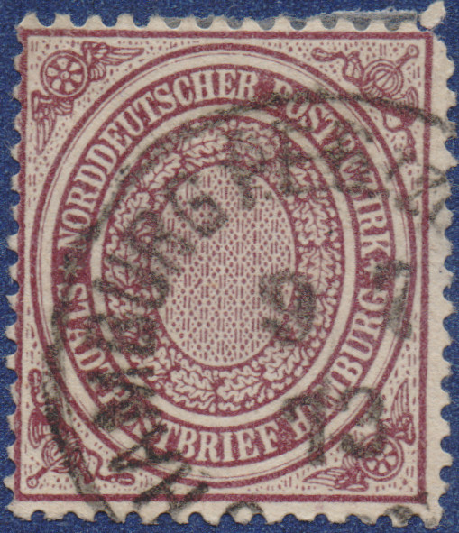 Briefmarke mit einer Entwertung durch den NDP K1-Stempel "Hamburg P.E.6. (Zollverein)" am 09.07.1873.