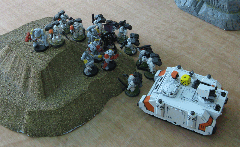 Andre gelang es in den ersten beiden Runden praktisch fast alle meien Fahrzeuge so auszuschalten, das meine Bewegungsfreiheit gleich null war. Mein Vindivator kam gar nicht zu Wirkung und meine Marines standen dumm rumm. Mein Sturmtrupp reagierte mit einen Kamikaze-Angriff in seine Zone und wurde auch noch ignoriert.