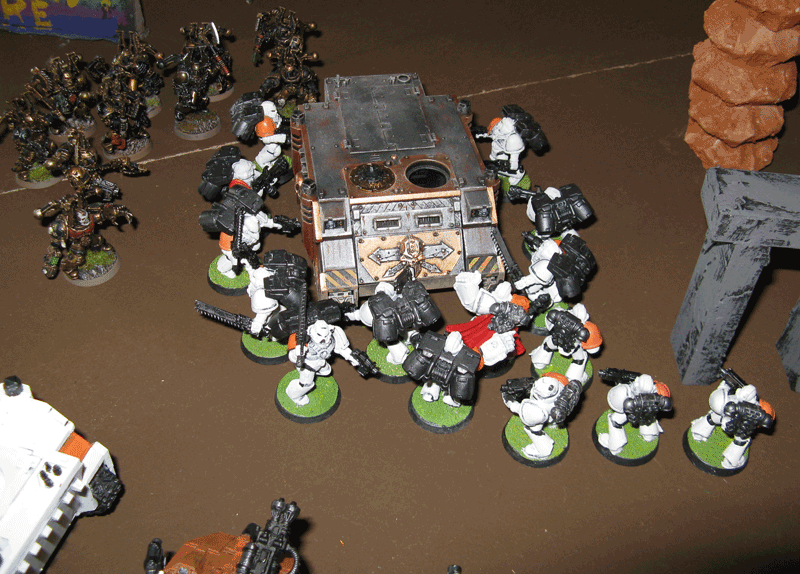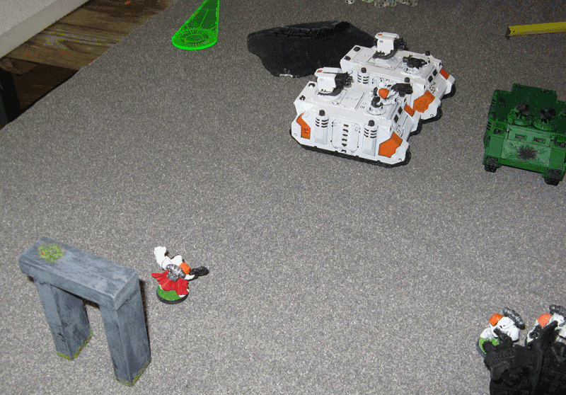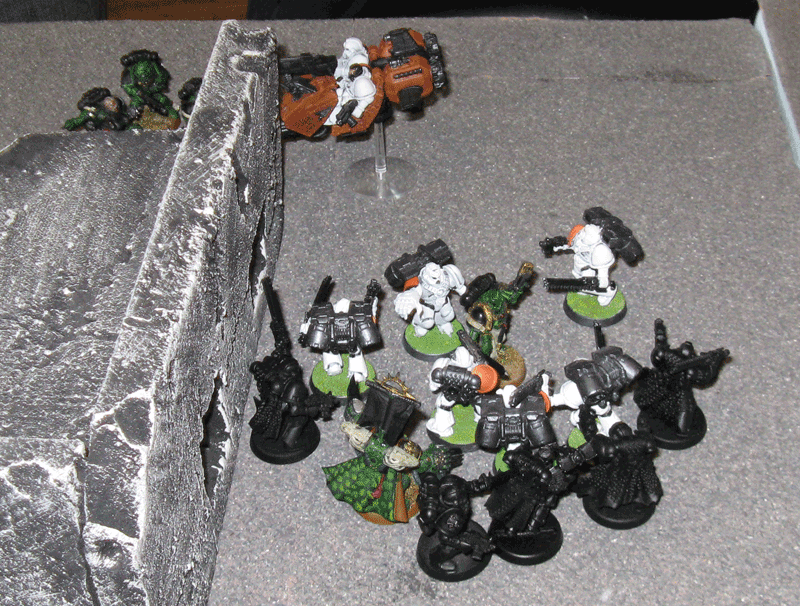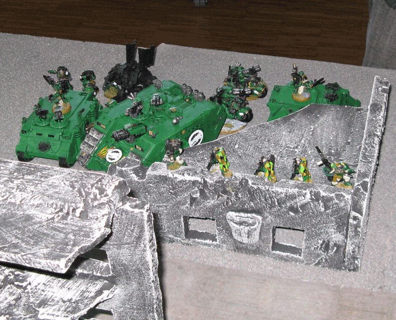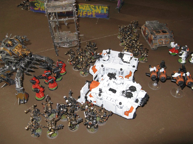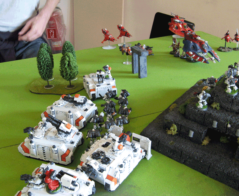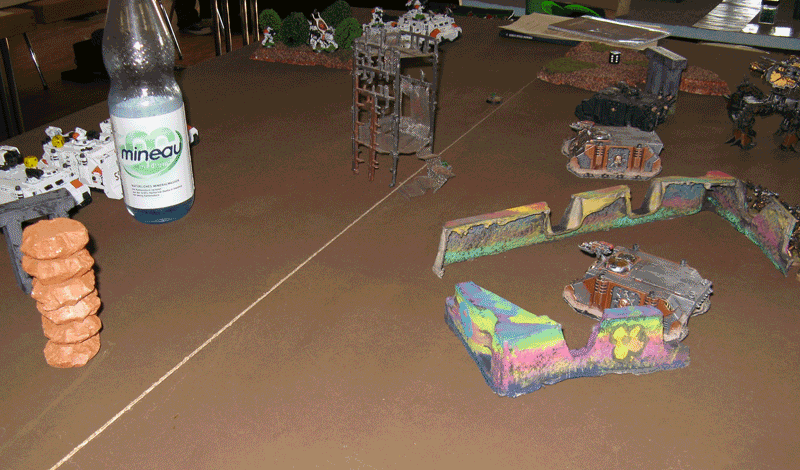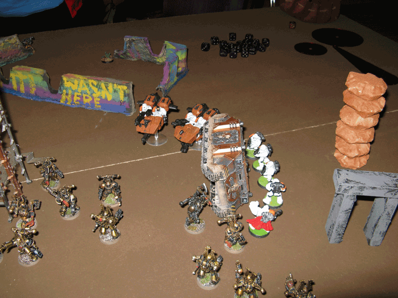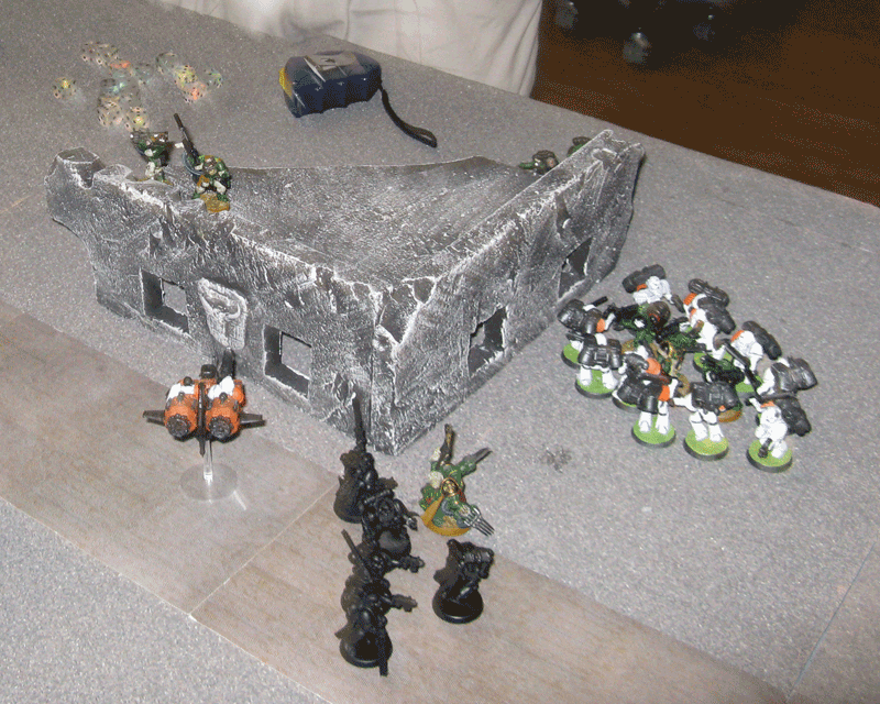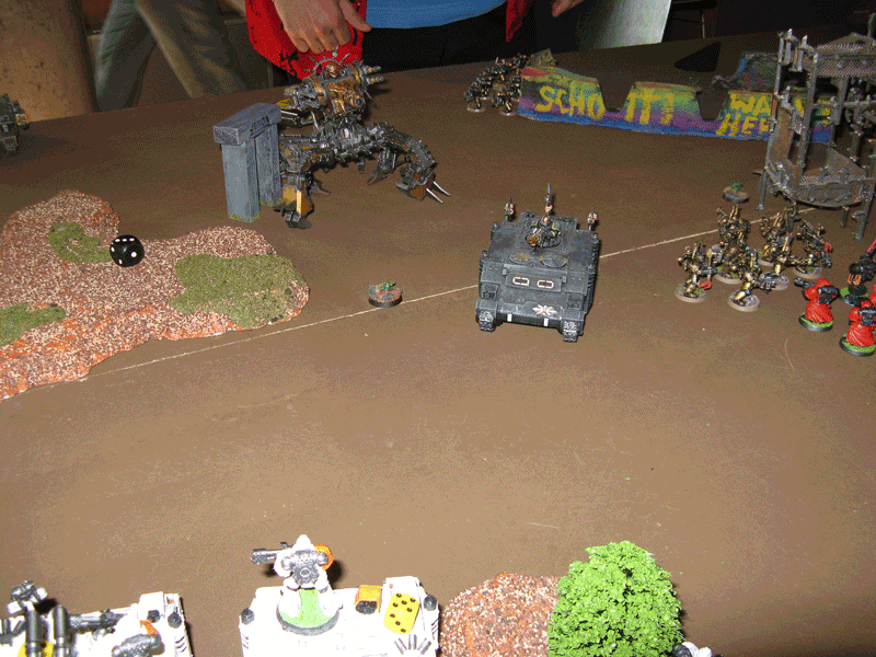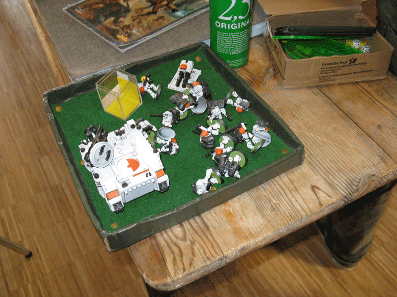 Nach der 5.Runde war das Spiel vorbei, da wir das Spiel keine Runde länger durchziehen wollten, da der Sieger feststand. Einzig seine Falcons inklusive eines transportierten Trupps stand zum Schluß noch. Der Rest war vernichtet. Bei mir zwar inzwischen auch der Vindicator und der Sturmtrupp, aber der Rest von mir war noch gut mobil und schlagkräftig.