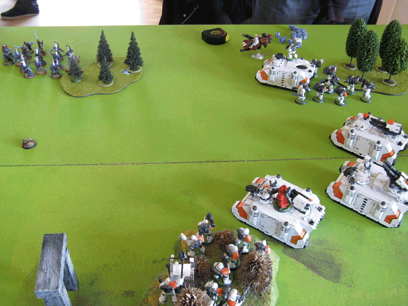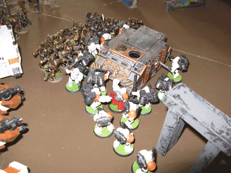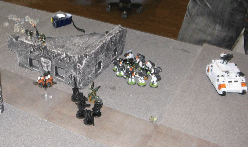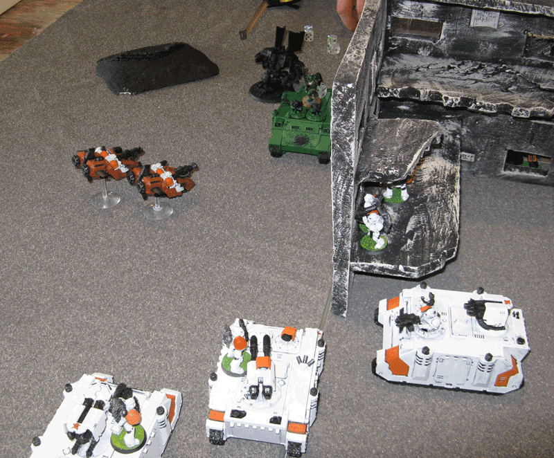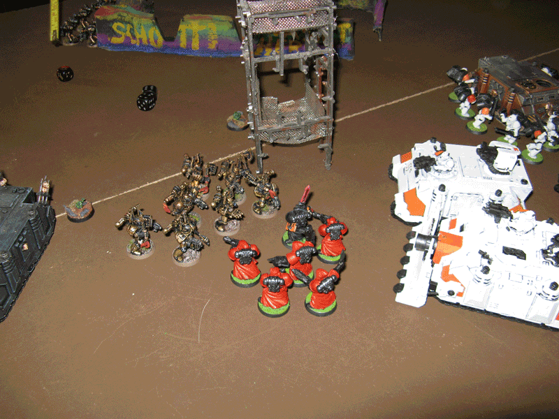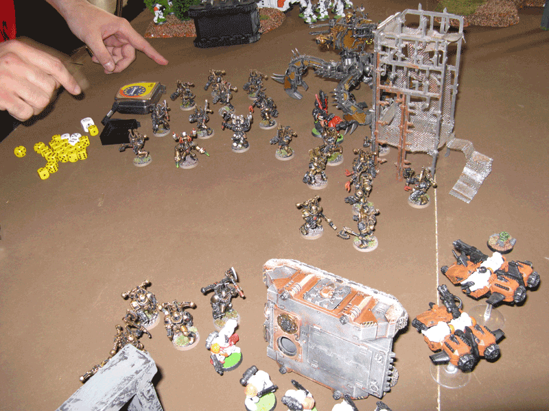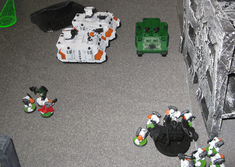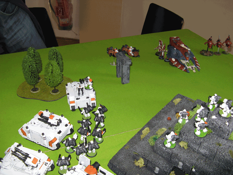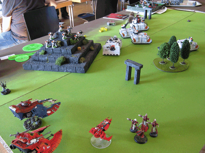 Die rechte Flanke in der 2.Runde. Hier hatte ich mit meiner Protektorgarde den Landraider schon beseitigt und bin im Nahkampf mit seiner HQ. Mein Sturmtrupp hat währenddessen zwei Trikes vernascht.