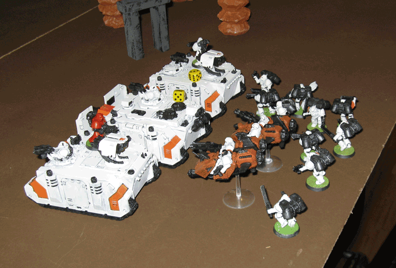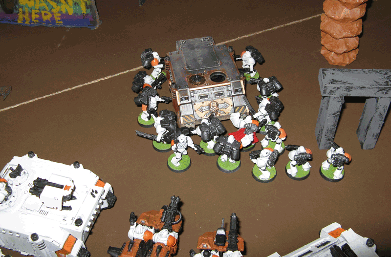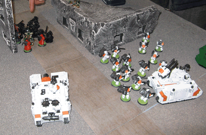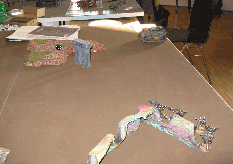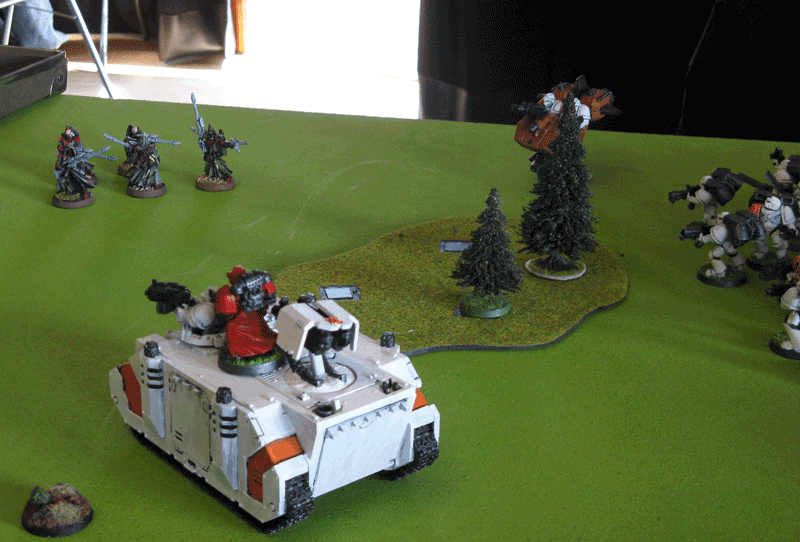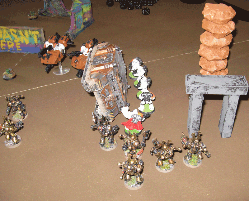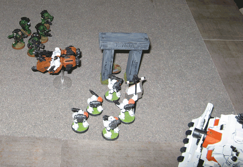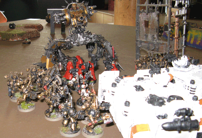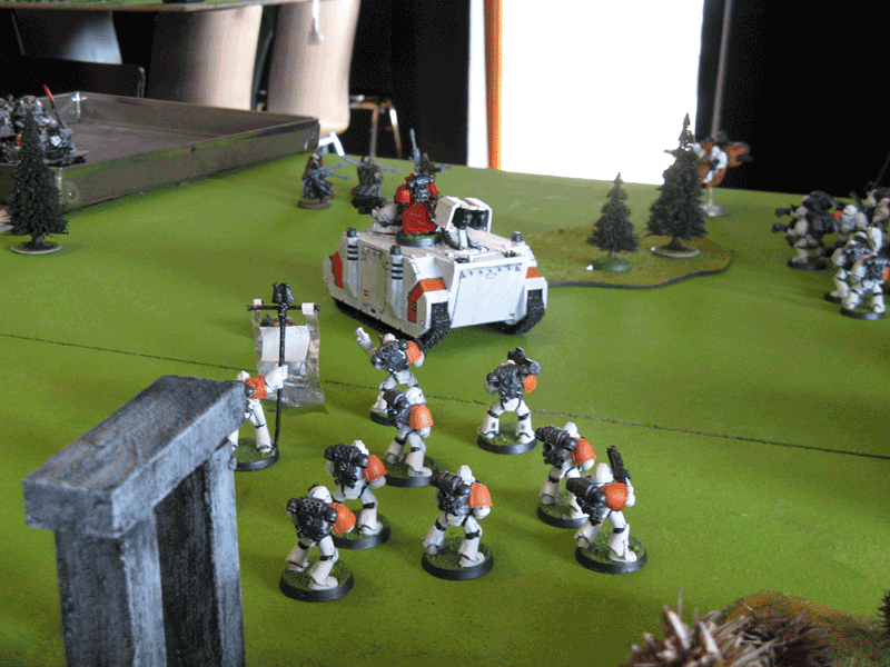 Die rechte Flanke in der 2.Runde. Hier hatte ich mit meiner Protektorgarde den Landraider schon beseitigt und bin im Nahkampf mit seiner HQ. Mein Sturmtrupp hat währenddessen zwei Trikes vernascht.
