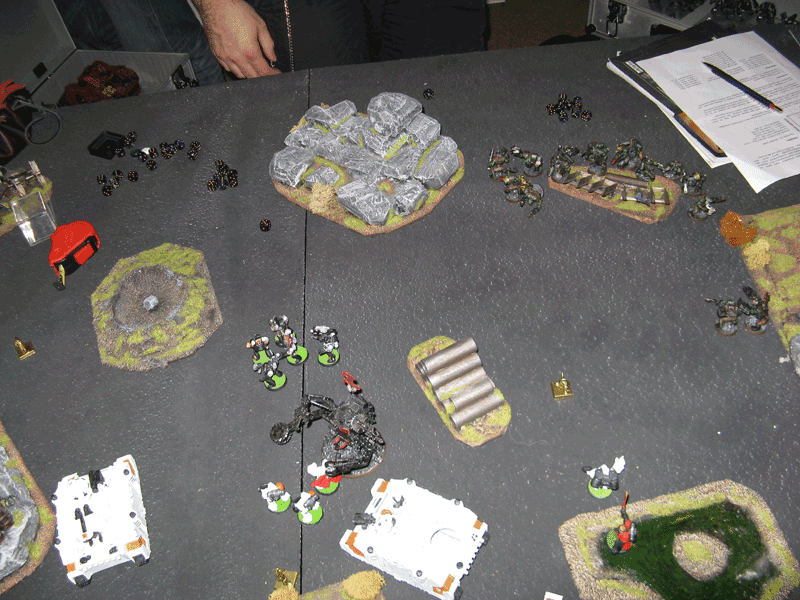 Im Hintergrund die Legion die in der 6 Runde erschien (dazu gleich mehr). Sie schiessen zusammen mit einem Razorback alle Orks bei dem einen Marker weg (da, wo der Scriptor down ging).