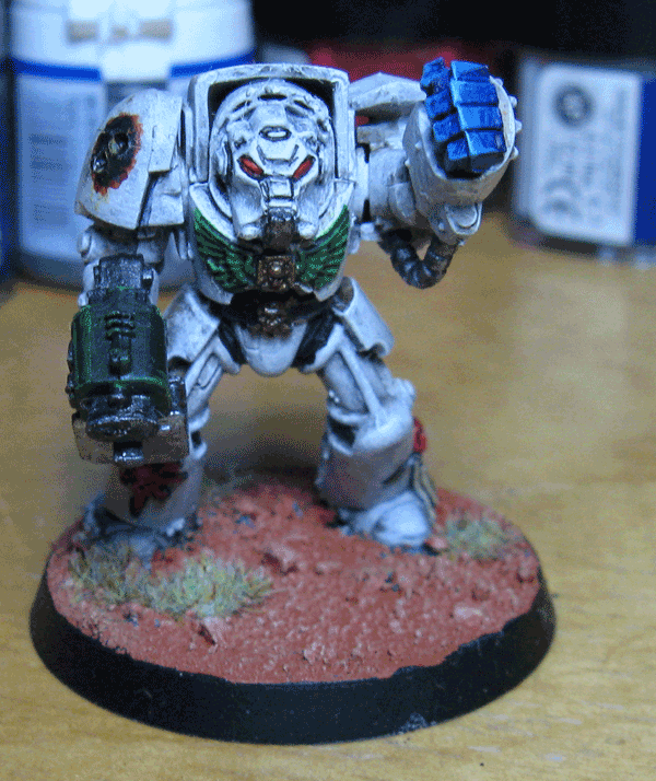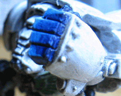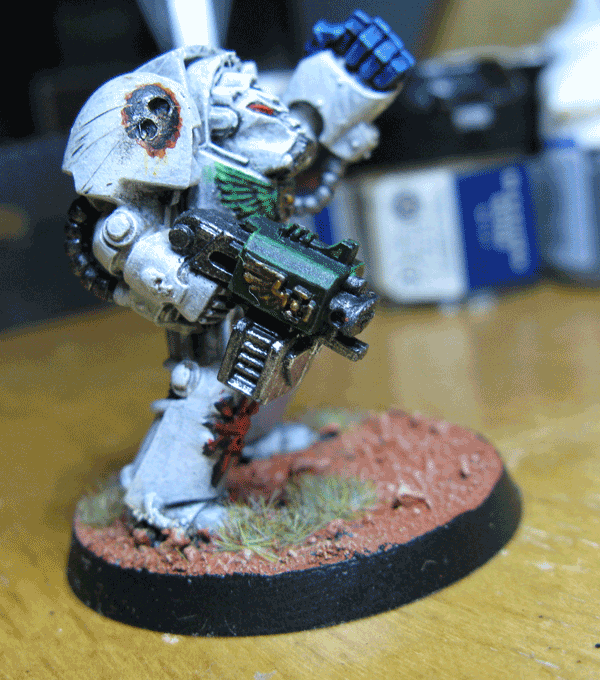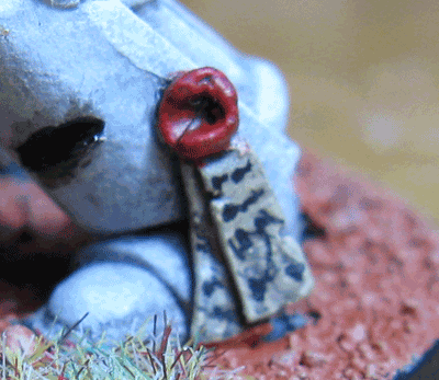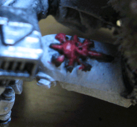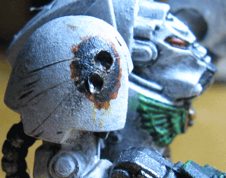 Kurz vor Ende der Figur habe ich noch Gefechtsschäden eingebaut um die Wirkung und Maltechniken zu testen, da es diesbezüglich meine ersten Versuche sind.