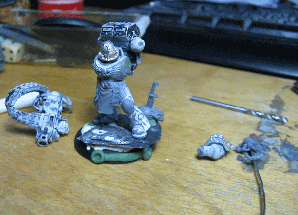Der Servoschädel wird dann noch so angebracht, das er über den Marine hinwegschaut. Dieses unterstreicht zum einen der Haltung des Marines und unterstützt die generelle Blickrichtung.