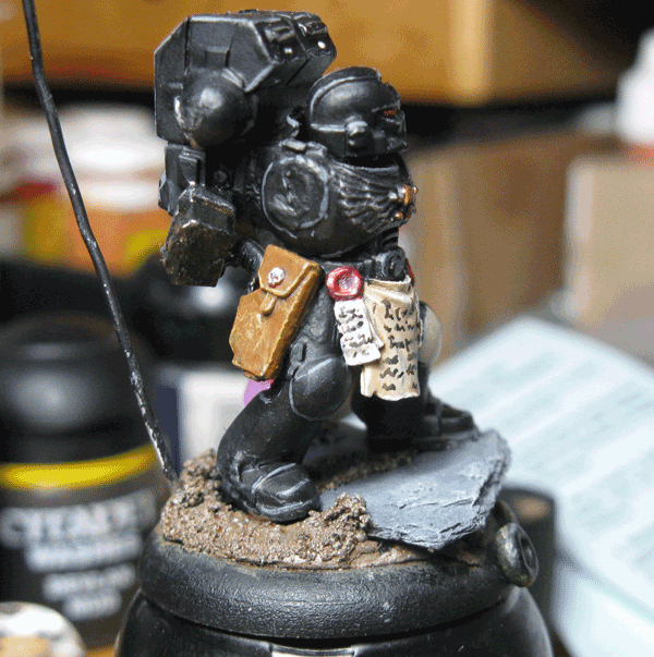 Den Körper hat als Grundfarbe schwarz. Zum akzentuieren nutzte ich ein dunkles Grau. Um etwas Farbe rein zu bringen erhielt sowohl der Halfter für die Boltpistole, als auch die Pergamente eine hellere Farbe.