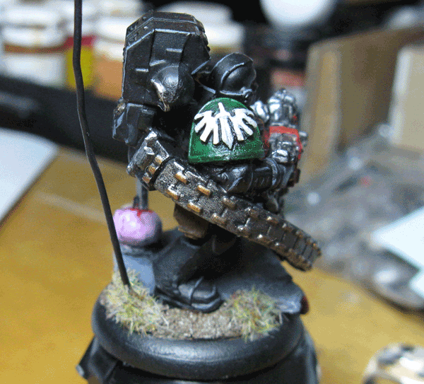 Die Waffe erhielt das traditionelle Dark Angel rot. Die Munitionszuführung wurde mit einem dunkleren bzw. abschattiertes Metall bemalt. Das Schulterpad mit dem Ordensymbol hat natürlich Dark Angel Green mit schwachen Akzenten erhalten.