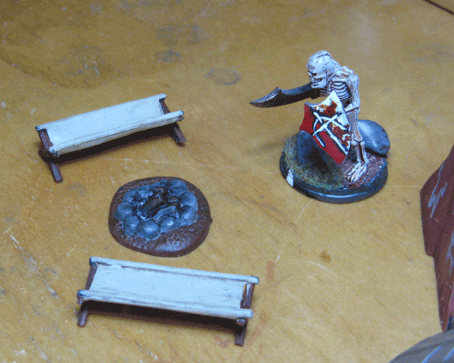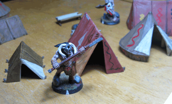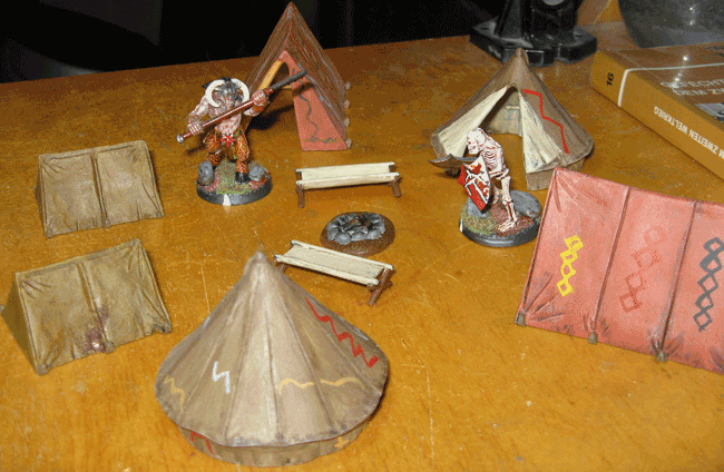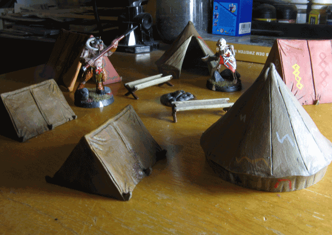 Nach einer Grundierung geht die Bemalung recht fix. Etwas Wash, danach leichtes hellere Brushen und etwas Mattlack zum versiegeln sind die Zelte schnell fertig zum Spielbetrieb.