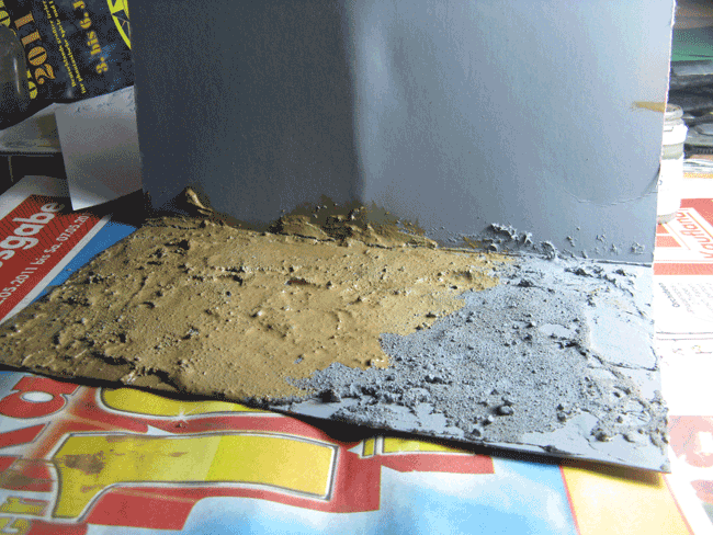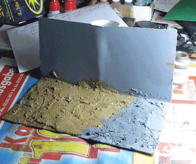 Die Pappe wurde grob in einem Rechteck zurechtgeschnitten. Danach in der Mitte gefaltet und die eine Hälfte mit Spachtelmasse und Sand bestrichen.