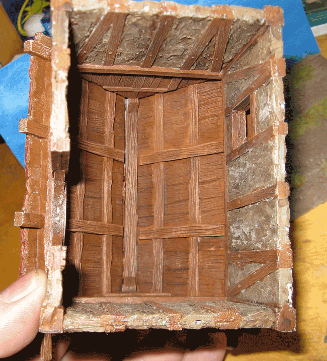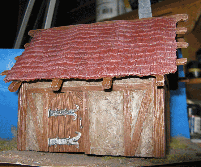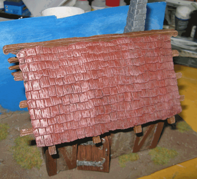 Grau grundiert. Wände in Graveyard Earth. Balken mit Bestial Brown. Dach mit Terracotta. Alles geinkt mit Devlun Mud und dann einfach in hellerer Version gebrusht.