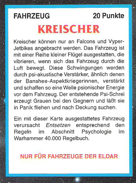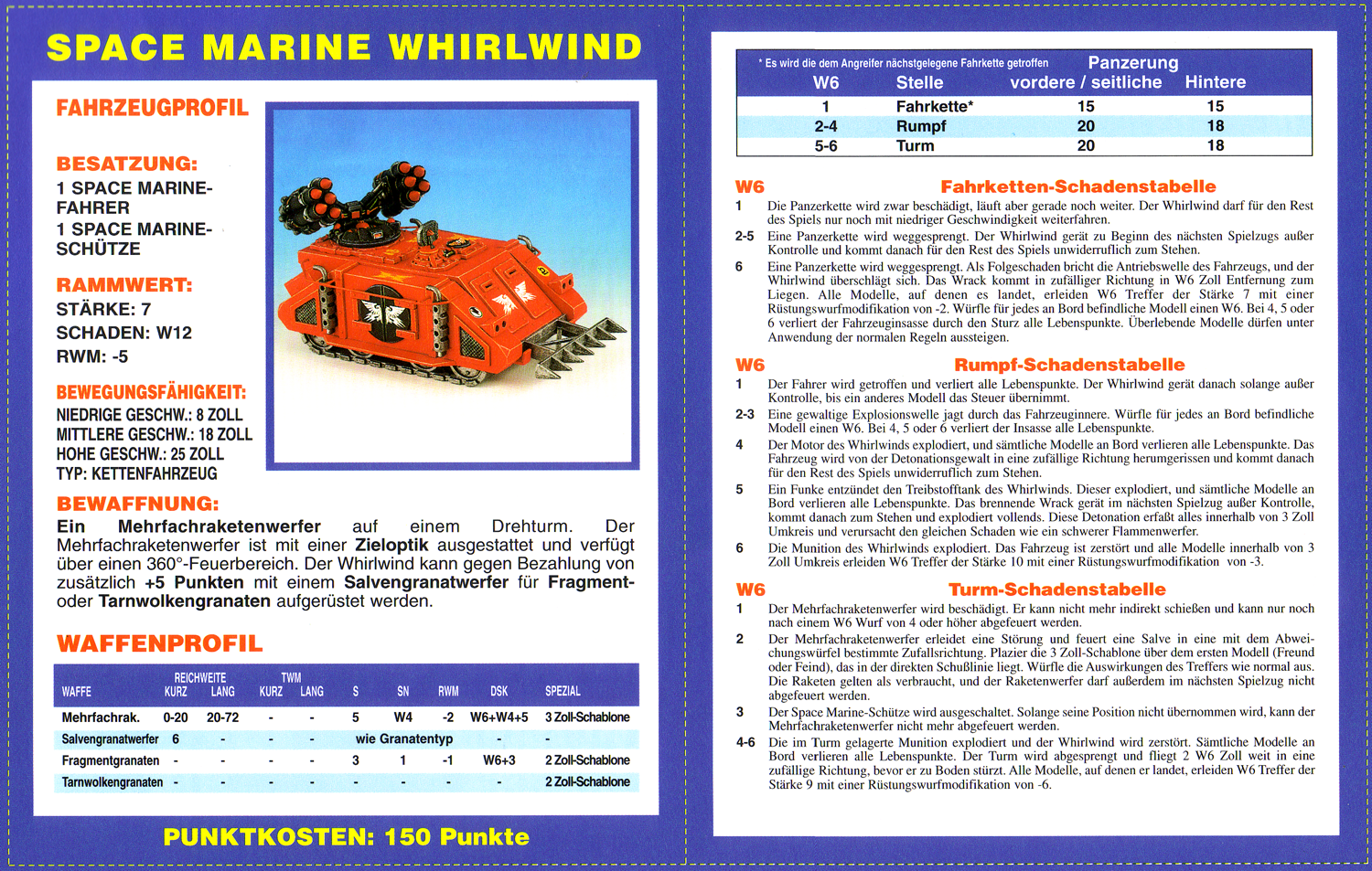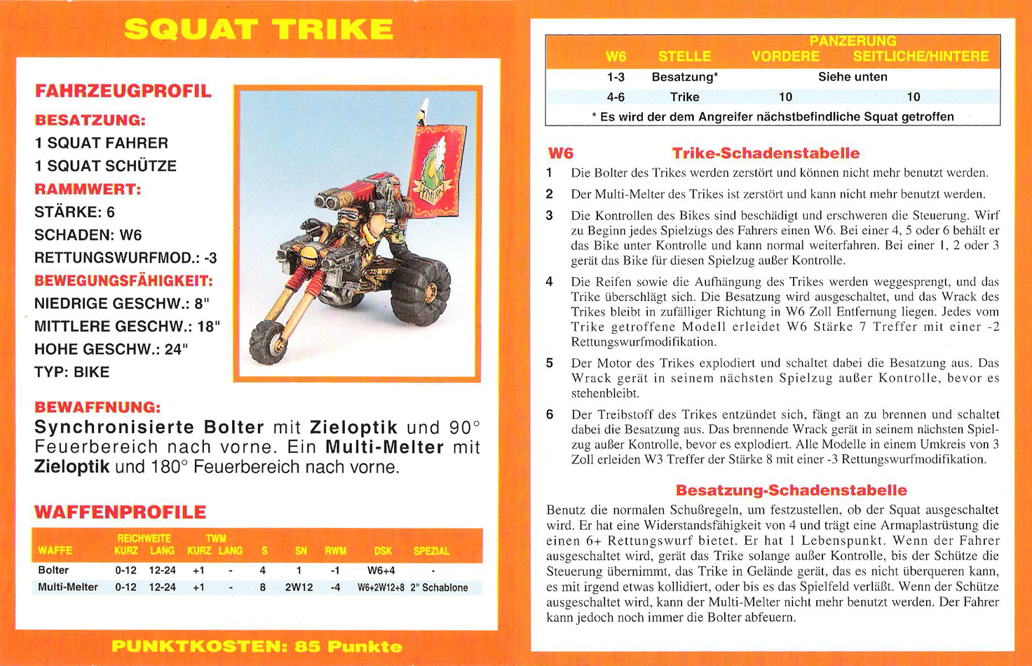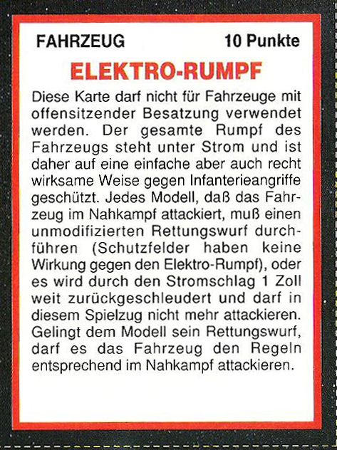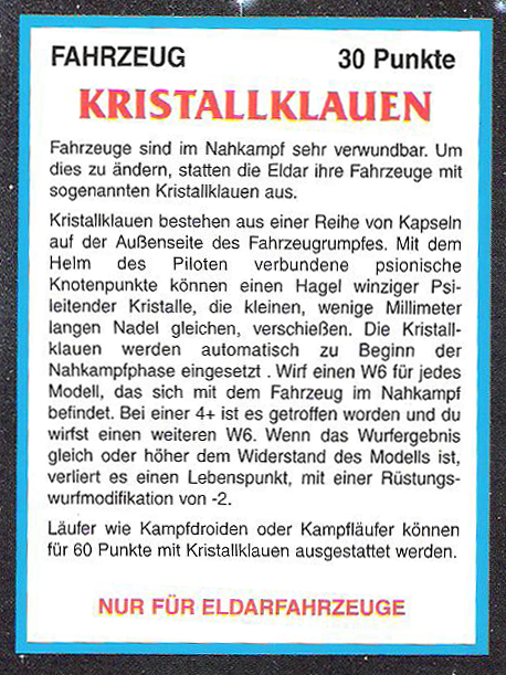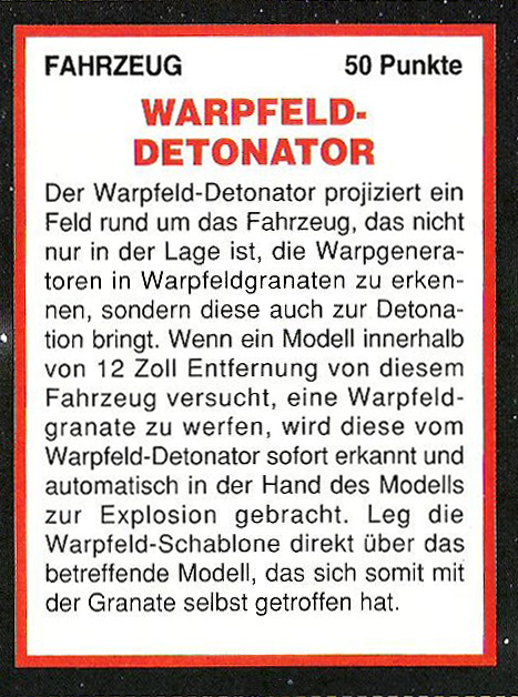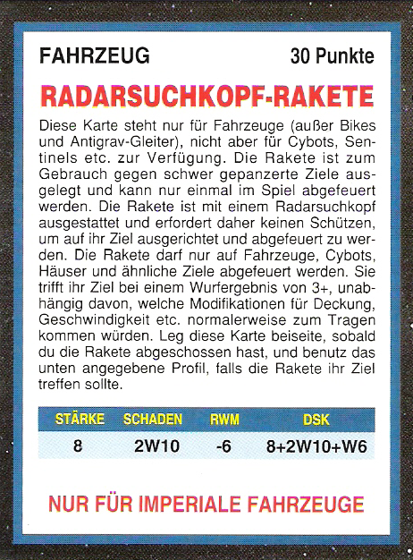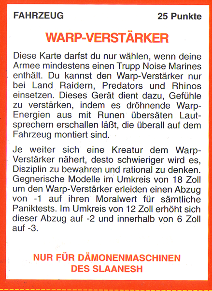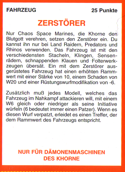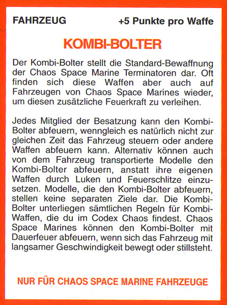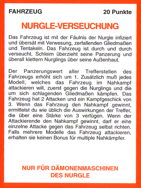 FAQ: 2nd Edition hat einen seeehr langen FAQ/Errata, hier muss man aber ein wenig vorsichtig sein, manches ist veraltet (bspw. Noisemarines, die Ausführungen beziehen sich auf die Regeln aus dem Black Codex, der Codex Chaos hat diese dann aktualisiert). Norton hatte bei mir btw. mal wegen der Seite gemeckert, obwohl nie etwas versucht worden ist (ich teile auf, weil Links nicht erlaubt sind). Einiges ändert hier grundlegendes (Modelle dürfen aus fahrenden Fahrzeugen chargen, was eigentlich der Reihenfolge nach unmöglich ist, Gunner von Fahrzeugen dürfen Overwatch nutzen, wenn das Fahrzeug fährt, etc). Hmm, hilft nichts, mit der url herumzuspielen, gehe mal ins Eastern Fringe Forum (gute Wahl für 2nd), dort in die 2nd Edition Abteilung und suche auf der zweiten Seite nach dem FAQ Thread von mir. |
