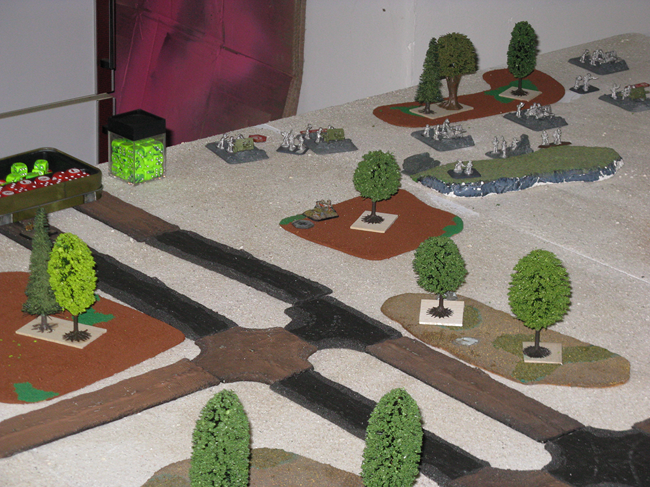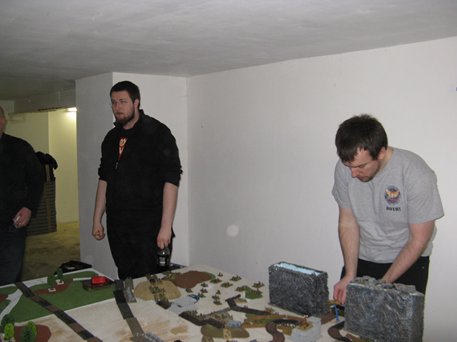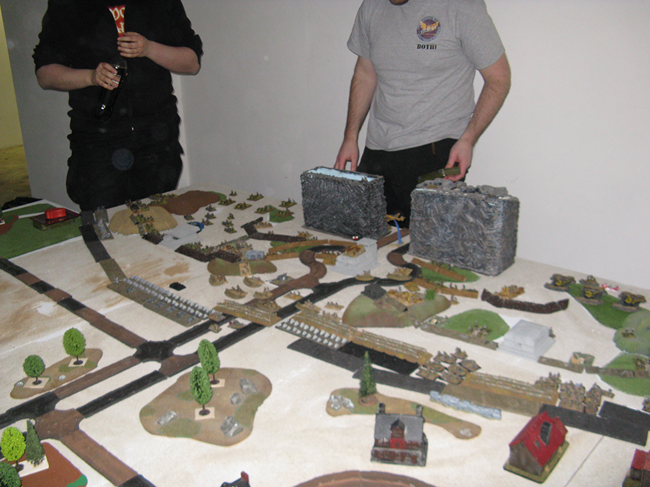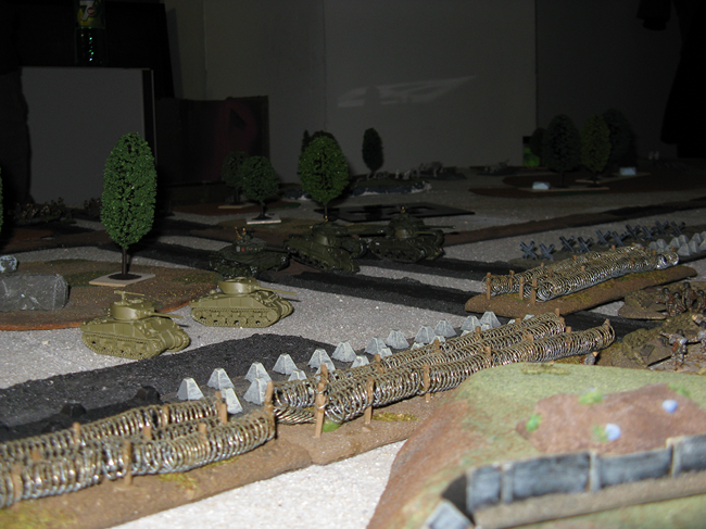 Zuerst wurde die Platte mit dem Gelände aufgestellt. Hiernach konnte sich beide Parteien diese Anschauen und entsprechende Strategien entwickeln. Hauptziel für die Alliierten war der Bunker im zentralen Verteidigungsbereich, schnell erreichbar über die Straße. Rechts und links von der Straße befanden sich Befestigungsanlagen und Panzersperren, sowie vereinzelte Bunker und MG-Nester.