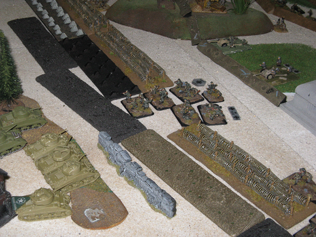 Die Shermans schiessen aus dem Wald auf sechs Zoll erstmal ein Base meines 1.Zuges weg. Lustigerweise gelangten zwei Shermans gar nicht erst in den Wald... blöde 1 halt.