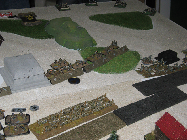 Nachdem Phillip kurzfristig ausfiel, wurden die Deutschen auf 1000 Punkte je Armee reduziert. Da ich meine grundlegende Struktur nicht ändern wollte, fiel bei mir der Pionierzug, das Panzerschreck Team und ein MG-Nest weg. Insbesondere das Schreckteam war ärgerlich, da ich ja keine Panzerfäuste hatte um den Effekt auszugleichen.