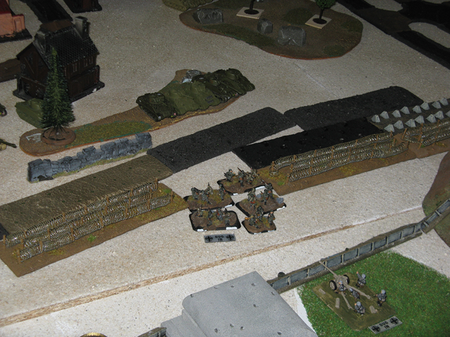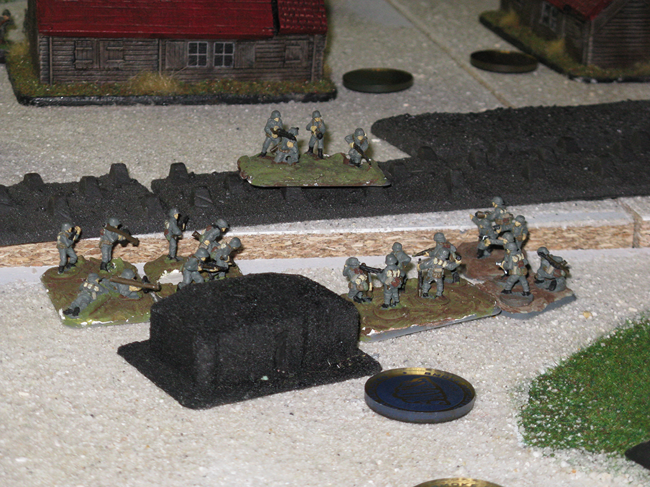 Die feindlichen Truppen sammeln sich vor den Stellungen der deutschen und versuchen den blockierenden Infanteriezug zu bekämpfen. Trotz Nebel gelang es nicht diesen anzugreifen, weil der angreifende Zug durch sechs Treffer gepinnt wurde.